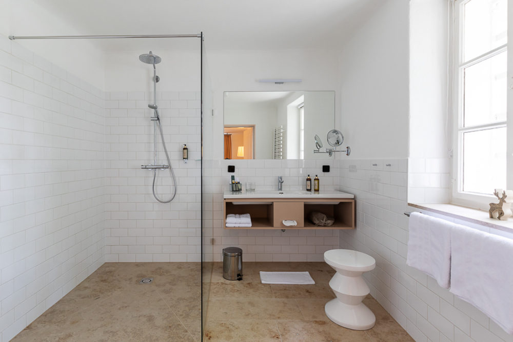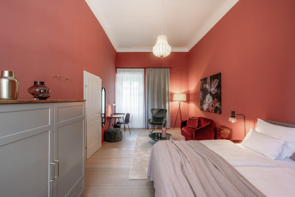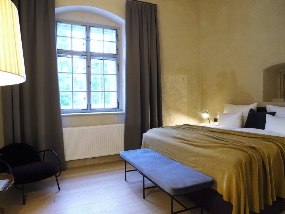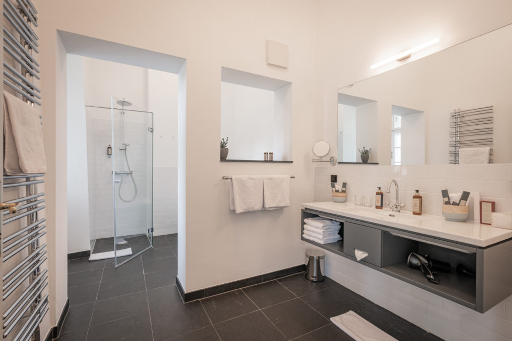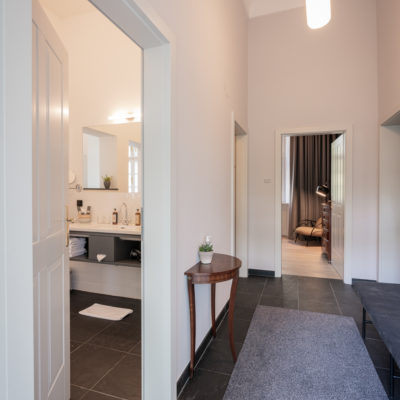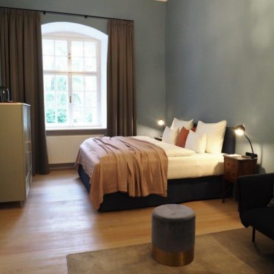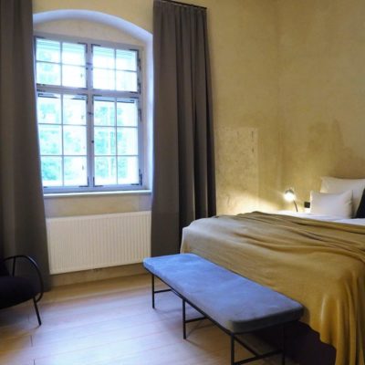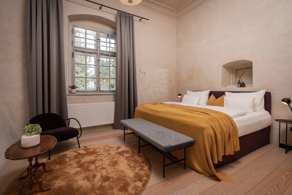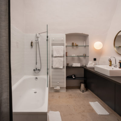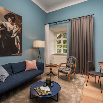 Approximately 55m² suite. Located above the imposing chimney flue of the former castle kitchen, the dimensions can be envisaged based on the impressively slanted fireplace walls. A magnificent symbiosis of historically listed, restored murals and the elegant signature-design of POLKA. Beautiful salon facing the arcaded walkway and a separate bedroom overlooking the Arboretum. Semi-open bathroom with bathtub.
