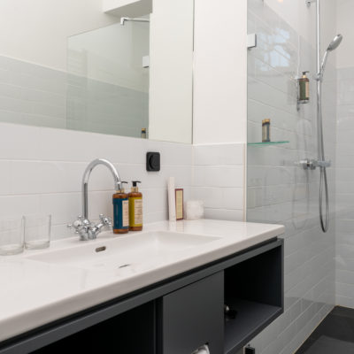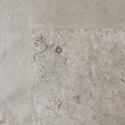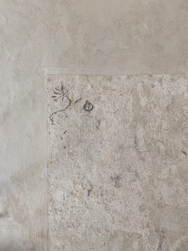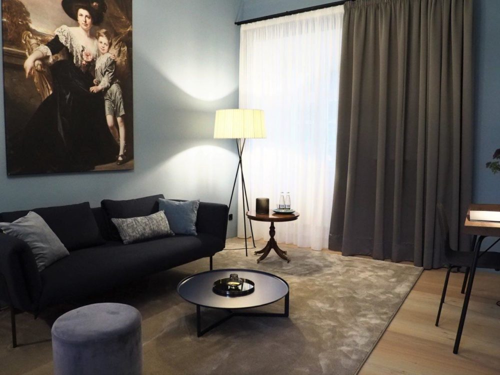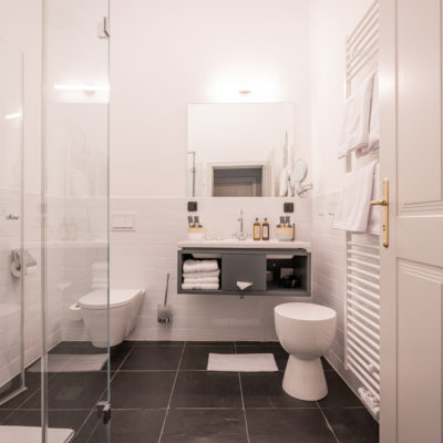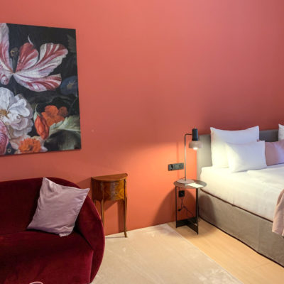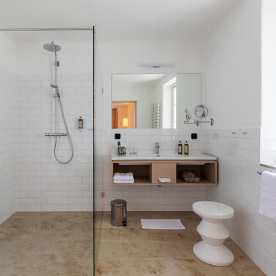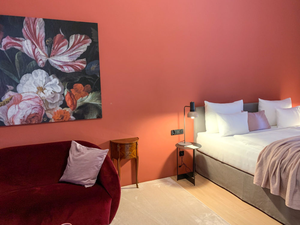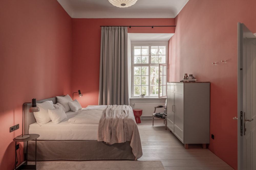 Approximately 55m² suite. Located above the imposing chimney flue of the former castle kitchen, the dimensions can be envisaged based on the impressively slanted fireplace walls. A magnificent symbiosis of historically listed, restored murals and the elegant signature-design of POLKA. Beautiful salon facing the arcaded walkway and a separate bedroom overlooking the Arboretum. Semi-open bathroom with bathtub.