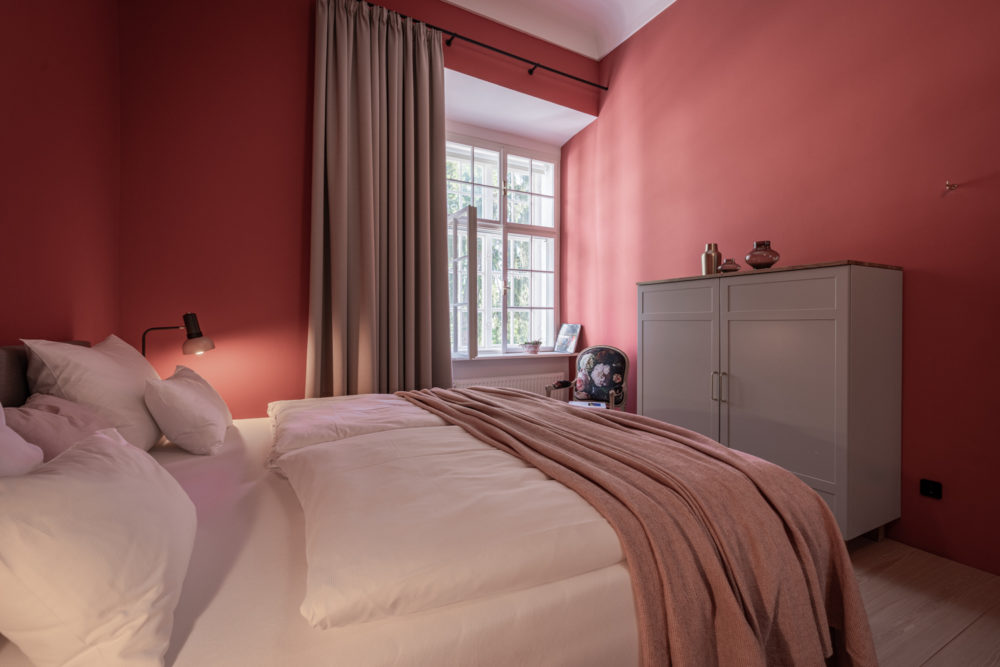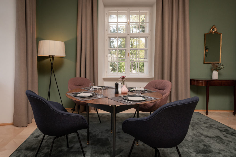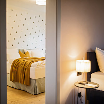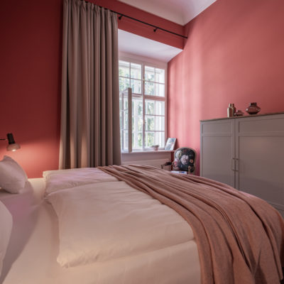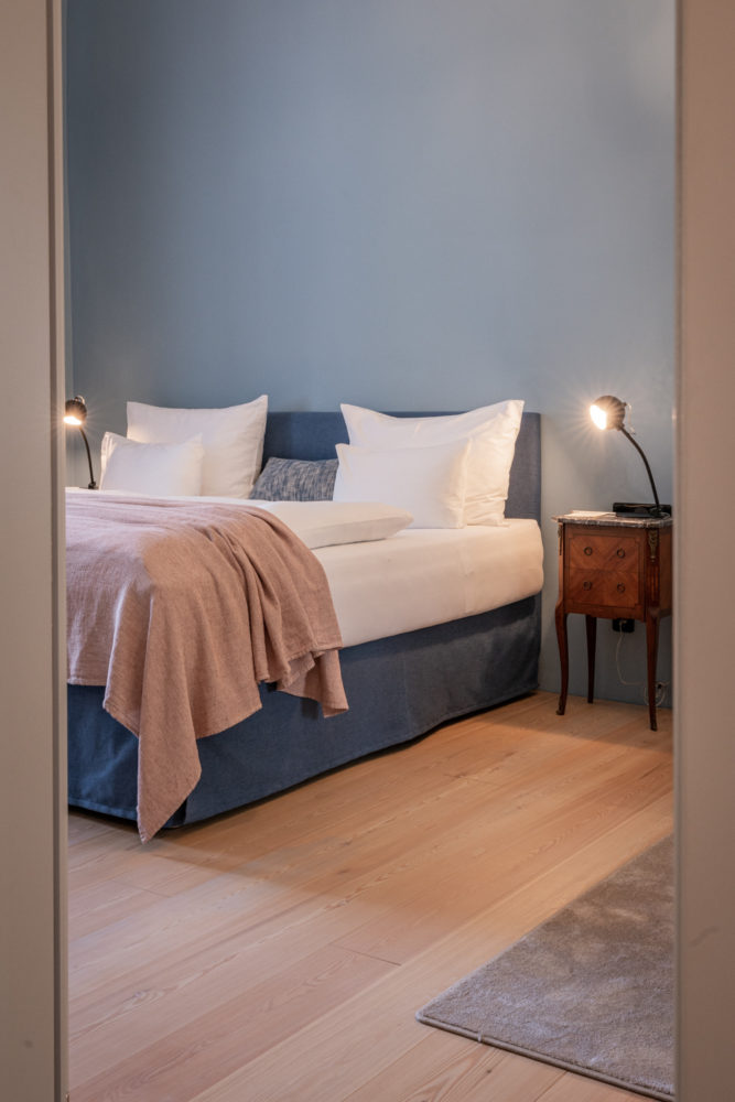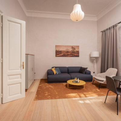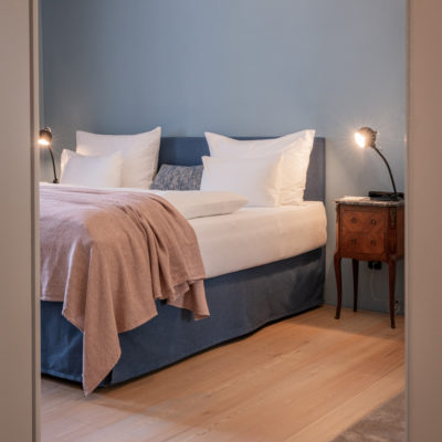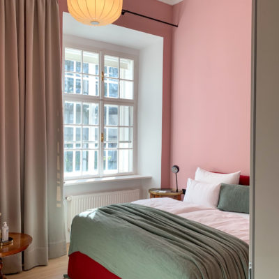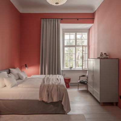 Approximately 65m² suite with 2 separate bedrooms. Self-assured color and wallpaper themes coupled with restoration of historically listed elements. Timeless furnishing design curated by POLKA, on long, roughly textured spruce floorboards. Perfect rooms for families or friends.